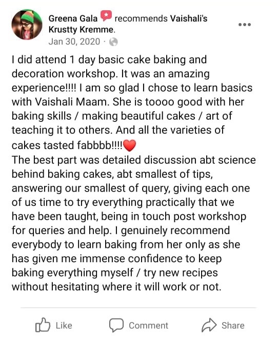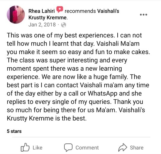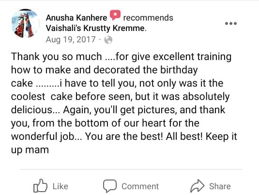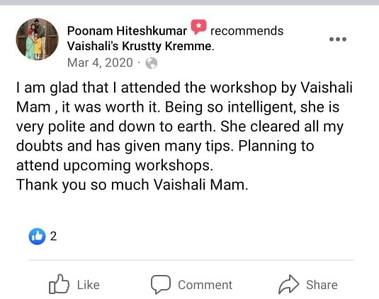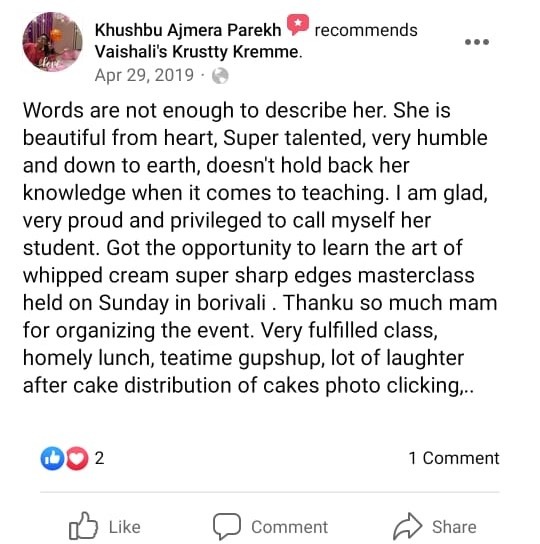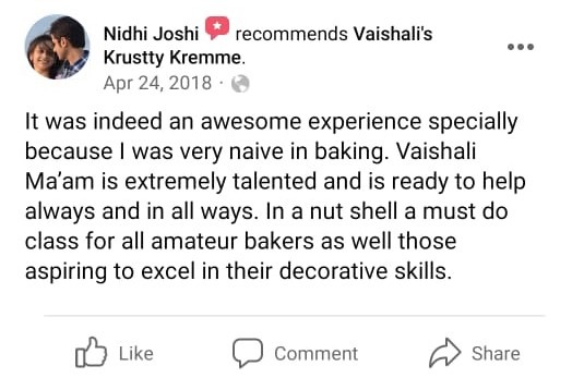 Chef Vaishali is a prime baker and principle of Vaishali’s Krustty Kremme . a school for baking and decorating arts.With her relentless efforts and passion for baking she has made it as a trusted name in the baking education industry. Chef Vaishali has a vision to train more than 100000women who have passion for baking and help them make self-reliant and financially independent by helping them start home baking business.